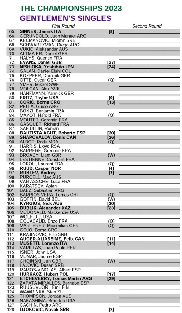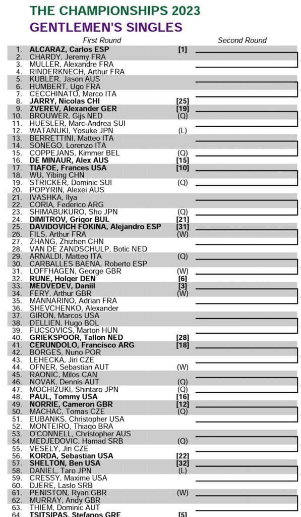 Sign in Welcome! Log into your account your username your password Forgot your password? Get help Privacy policy Password recovery Recover your password your email A password will be e-mailed to you. Wimbledon, tabellone maschile: Sinner dalla parte di Djokovic NewsTennis MaschileATPTornei del Grande Slam MaschiliWimbledon Fabio Spoti 30 Giugno 2023 0 FacebookTwitterWhatsAppEmailStampaTelegramCopy URL Ecco il tabellone di Wimbledon Articoli correlati US OPEN 2025: Alcaraz fa suo il... News 7 Settembre 2025 Caroline Garcia annuncia il ritiro dal tennis... News 23 Maggio 2025 Jasmine Paolini trionfa al WTA 1000 di... News 17 Maggio 2025 Internazionali d’Italia 2025: straordinario Musetti. Batte Zverev... ATP 14 Maggio 2025 COMMENTI Rispondi Cancella RispostaAccedi per commentare CONDIVIDI FacebookTwitterWhatsAppEmailStampaTelegramCopy URL Ultimi articoli US OPEN 2025: Alcaraz fa suo il titolo e si riprende la prima posizione mondiale. News 7 Settembre 2025 0 Caroline Garcia annuncia il ritiro dal tennis professionistico: una carriera tra successi e coraggio personale News 23 Maggio 2025 0 Jasmine Paolini trionfa al WTA 1000 di Roma 2025: battuta Coco Gauff in due set News 17 Maggio 2025 0 Internazionali d’Italia 2025: straordinario Musetti. Batte Zverev e vola in semifinale. ATP 14 Maggio 2025 0 Jasmine Paolini si separa dal coach Renzo Furlan News 31 Marzo 2025 0